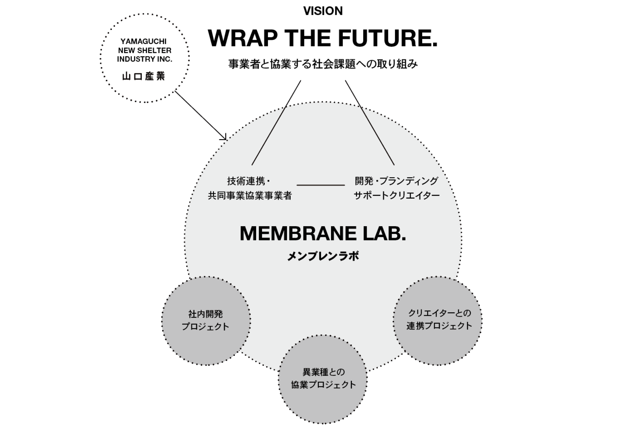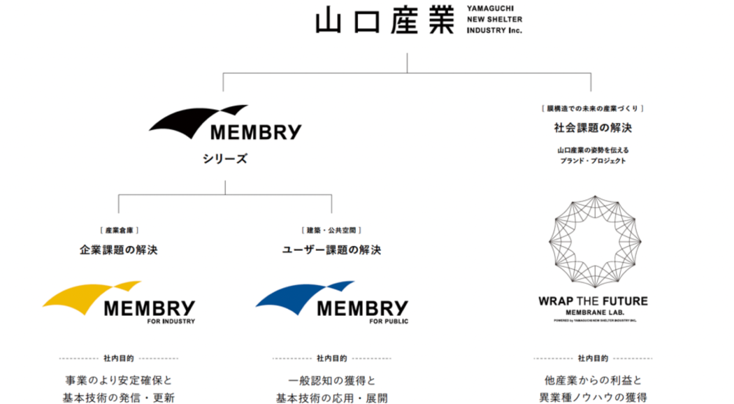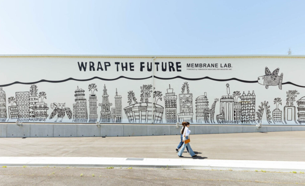 山口産業は、テント倉庫を中心とした膜構造建築の設計・施工を手がける専門企業です。膜素材の特性と専門技術を活かし、「膜構造建築で社会の課題に何ができるか」という問いから生まれたのが、同社のビジョン「WRAP THE FUTURE(ラップ・ザ・フューチャー)」。このビジョンの実現に向けて立ち上げられた社内プロジェクト「MEMBRANE LAB(メンブレインラボ)」では、農業、産業、防災、都市空間などをテーマに、異業種との協業や実験的プロジェクトを推進。人や社会、環境と膜をつなぎ、まだ見ぬ可能性をかたちにしていく場として活動しています。