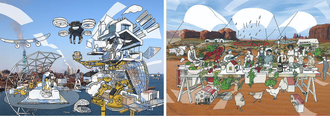 膜構造のある未来の風景を描くビジョンアートを、イラストレーター座二郎氏を起用して制作。展示会の壁面やカタログ誌面で使用されています。