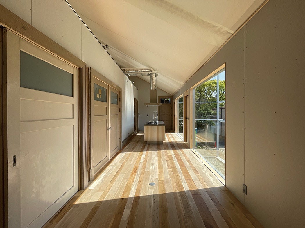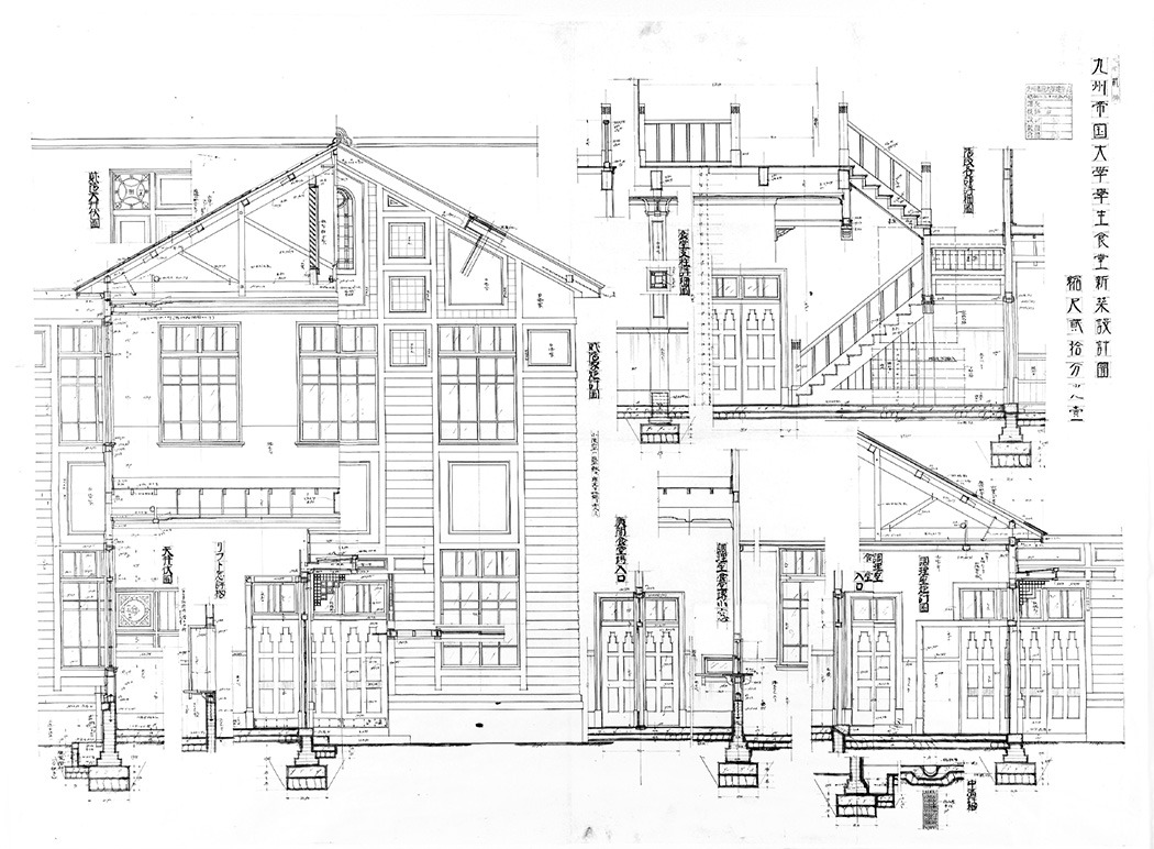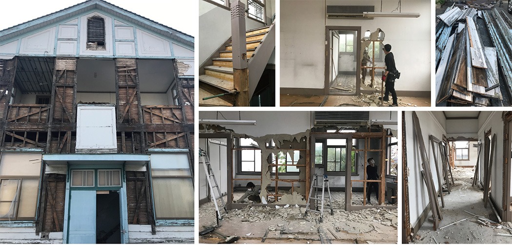 解体予定の建物の中で唯一残っていた建物である松浜更生施設を九州大学のご好意により譲り受けることになりました。限られた時間と条件の中で 何を選択して移築し、どのコンテクストで再構築するのか部材の選定を行いました。 構造部分には一切手をつけず、象徴的なファサードと室内の建具を生け捕りすることを目的に計画しました。 歴史的建築物の役割の1つは、街のランドスケープの一部として、人々の記憶のスイッチになることだと思います。建物が取り壊されると、その場所に何があったのかと思い出せなくなるように、人々から九大の記憶がなくなっていくことは避けたい。そこで街の景色の一部となっている外観の象徴的なファサードを再構築することを最優先に検討しました。しかし、確保した部材が老朽化しているために全てを使用することができませんでした。 そこで鉄骨フレームのまま建物の面影だけを残して建築ボリュームを「虚」と「実」の2つによって再構築すること。 一度、世の中から否定された建物が新材を使って依然と同じ形になるよりも十分に意味があると感じました。この「虚」の部分が建築的意味を持つことができます。