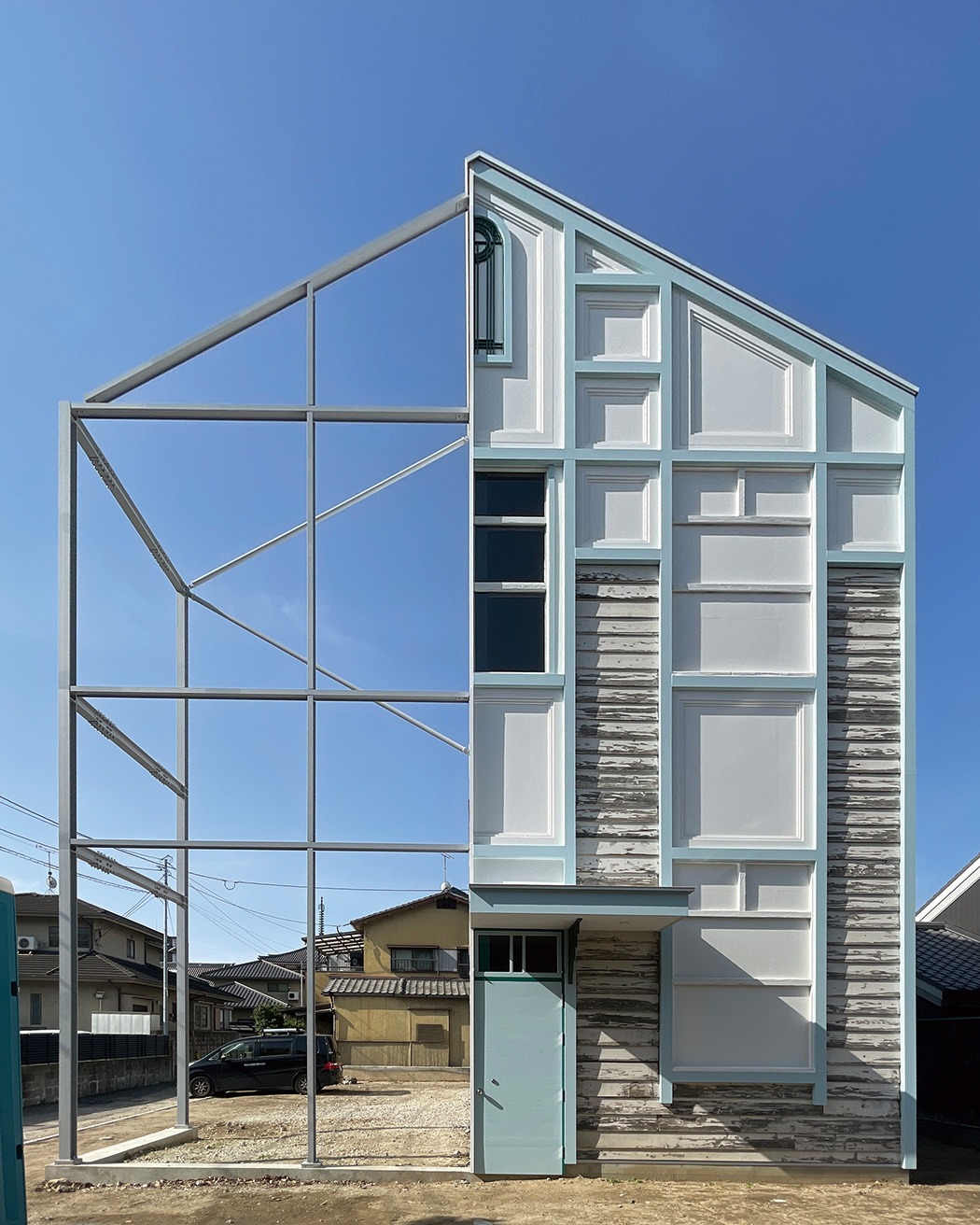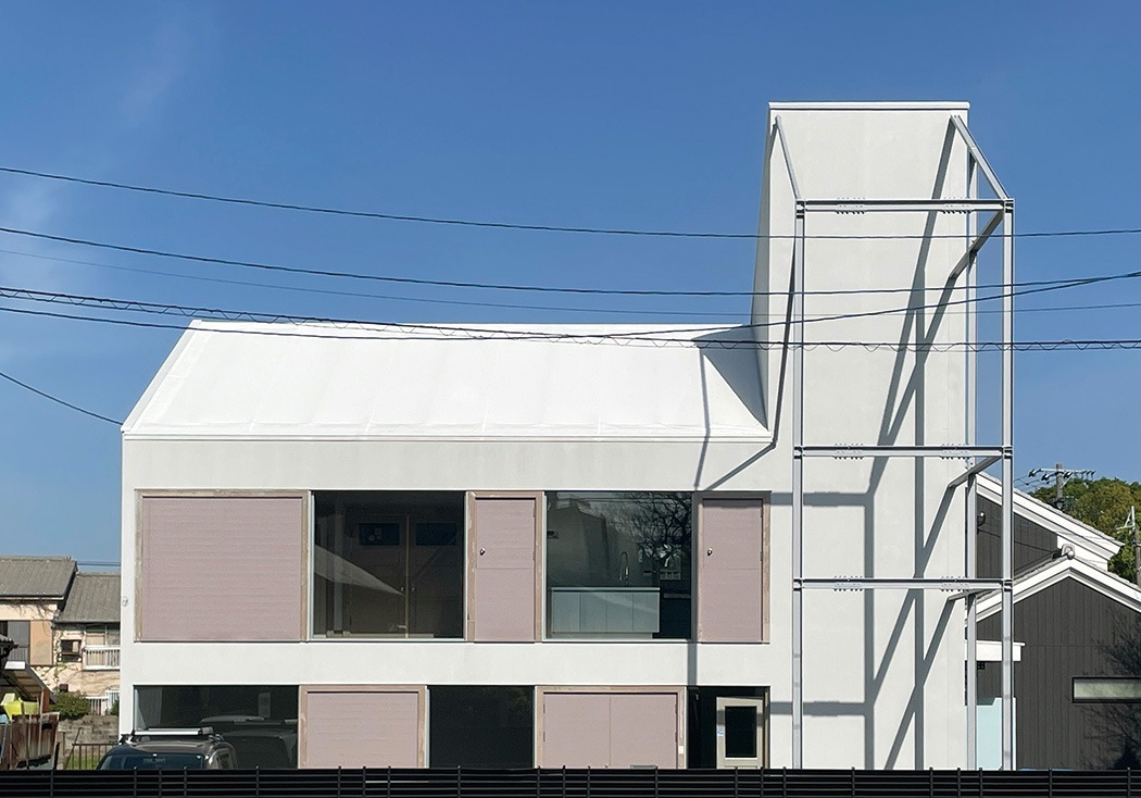 福岡・筥崎宮参道に面して建ち、1Fをオフィス、2Fを住空間とした職住一体の建物。1928年竣工の洋館建築・九州大学松浜厚生施設の歴史的要素を引き継ぐ。いわゆる文化財保存のように厳密な修理を行うのではなく、歴史的要素(historical elements)の再配置によって選択的移築を行い、その要素のもつ歴史的価値や元のコンテクストを新たな建築とつなぎ合わせた。歴史的建造物のファサードによる〈都市的記憶〉その〈実〉としての歴史的建造物のボリュームを再解釈した〈虚〉としての鉄骨フレームによってマッスとヴォイドの対比的な構成としている。建具と空間構成の再解釈による〈空間的記憶〉古い建具配置と気積のボリュームによる階段室や廊下空間を継承している。今後、〈虚〉として生まれたオープンスペースを活用し、地域に開かれた場、実装・実験の場として、街と新たに接続させる。