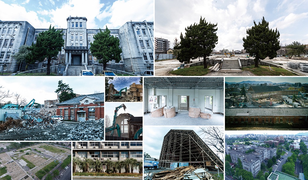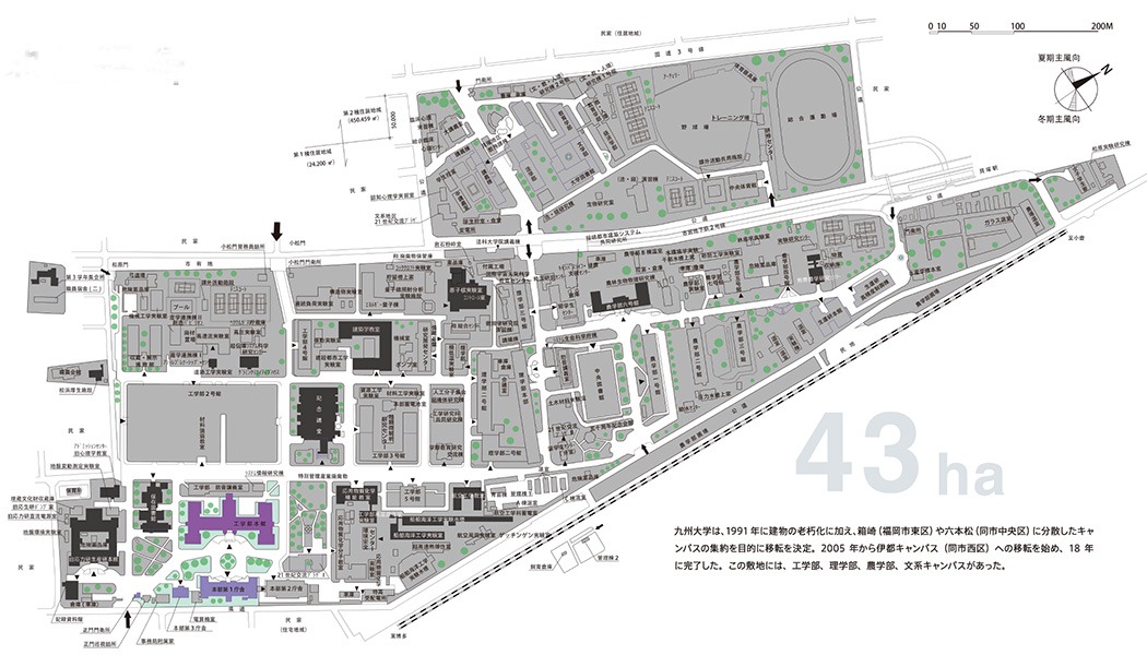 1911 年(明治44年)に九州大学の前身である九州帝国大学が今の福岡市東区箱崎に設立。約100年のあいだ、学問の地として日本の近代化を支えた人材を輩出してきました。2019年(平成30年度)、九州大学は、福岡市西区の伊都キャンパスへと移転が決定し、約43 ヘクタール(東京ドーム約9個分)の巨大な大学キャンパス跡地が生まれました。時代を象徴する近代建築群、3400本以上の豊かな樹木、そして日本を代表する知の歴史がありましたが、当初の計画により、一部の区域以外は全て解体・更地化が決定。現在は、旧工学部本館、本部庁舎、正門周辺と一部の樹木を残して、解体されています。
